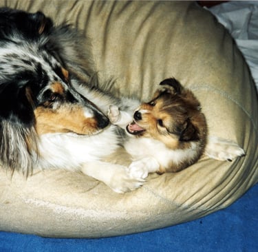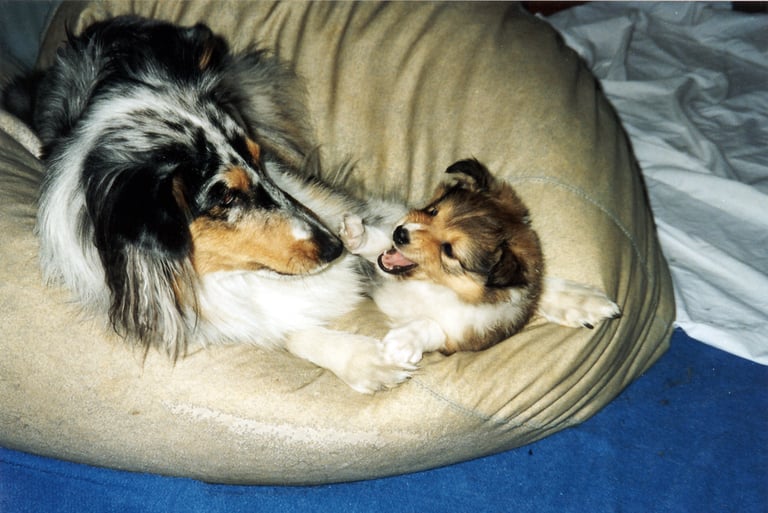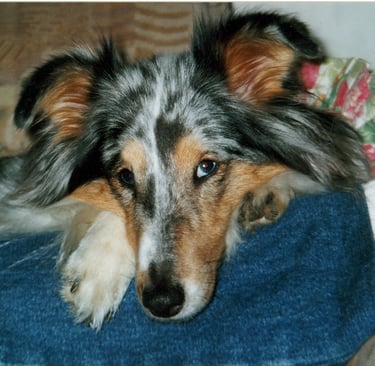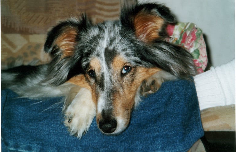 Olin haaveillut blue merle-värisestä sheltistä jo pitkään ja tämä upean värinen narttupentu muutti meille sijoitukseen 4kk ikäisenä suurin toivein. Lilli rakasti suurella sädämellä omaa perhettä. Lilli ei olisi tehnyt pahaa kärpäsellekään, se oli lempeä lastenhoitaja, joka jaksoi loputtoman kärsivällisesti leikkiä pikkupentujen kanssa. Ikävä kyllä lupaava pentu osoittautui erittäin araksi ja kasvaa hujahti 43cm korkeaksi. Lilli pelkäsi ihan kaikkea: ihmisiä, vieraita koiria, autoja, ääniä, sateenvarjoa. Sateenvarjoon päätin yrittää sitä siedättää, koska sateenvarjo kädessä ei voinut ulkoilla sen sinkoilematta paniikissa niin pitkälle kuin hihna riitti. Kun makuuhuoneen ja olohuoneen välisellä ovella oli avattu sateenvarjo, ei Lilli tullut makuuhuoneeseen kuukauteen. Lopulta koulutus kuitenkin tuotti tulosta. Monta kertaa Lilli juoksi metsästä paniikissa kotiin yli vilkasliikenteisen kadunkin, kun säikähti jotain irti juoksevaa isoa koiraa. Lilli opetti minulle valtavasti aran ja pehmeän koiran kanssa elämisestä ja sen kasvatuksesta. Se opetti minulle myös, millaisia shelttejä en halua kasvattaa.