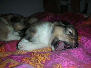 Tulipentue näki kuunvalon 9.11.2006. Seitsemän soopelipentua syntyi uskomattoman vaivattomasti ja ongelmattomasti ja kokenut emä hoiteli kaiken rauhallisesti ja varmasti! Kaksi ensimmäistä pentua Kipinä oli synnyttänyt sänkyyni. Loput tulivat sitten pentulaatikkoon, kun olin vastasyntyneet siirtänyt sinne. Pentueessa on viisi urosta ja kaksi narttua. Imetysvuoroja täytyi jakaa, kun pentueen pienemmät meinasivat jäädä tisseille rynnivien isompien sisarusten jalkoihin. Tämän pentueen kasvaessa kasvattaja sai myös tehdä hommia ihan hiki hatussa, kun kahden viikon ikäiset pennut sairastuivat rajuun vatsatautiin. Kun seitsemännen pennun sai lääkittyä ja nesteytettyä, olikin kohta aika aloittaa taas kierros alusta... Onneksi sitkeys palkittiin ja kaikki toipuivat lopulta hienosti!